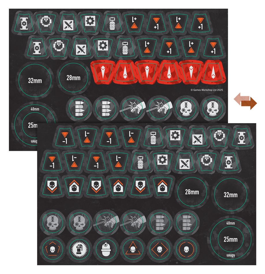 Dentro de la caja también encontrarás una hoja con 39 fichas de Deathwatch de doble cara, para que puedas llevar un control fácil de tu carga de armas y efectos dentro del juego en pleno combate.